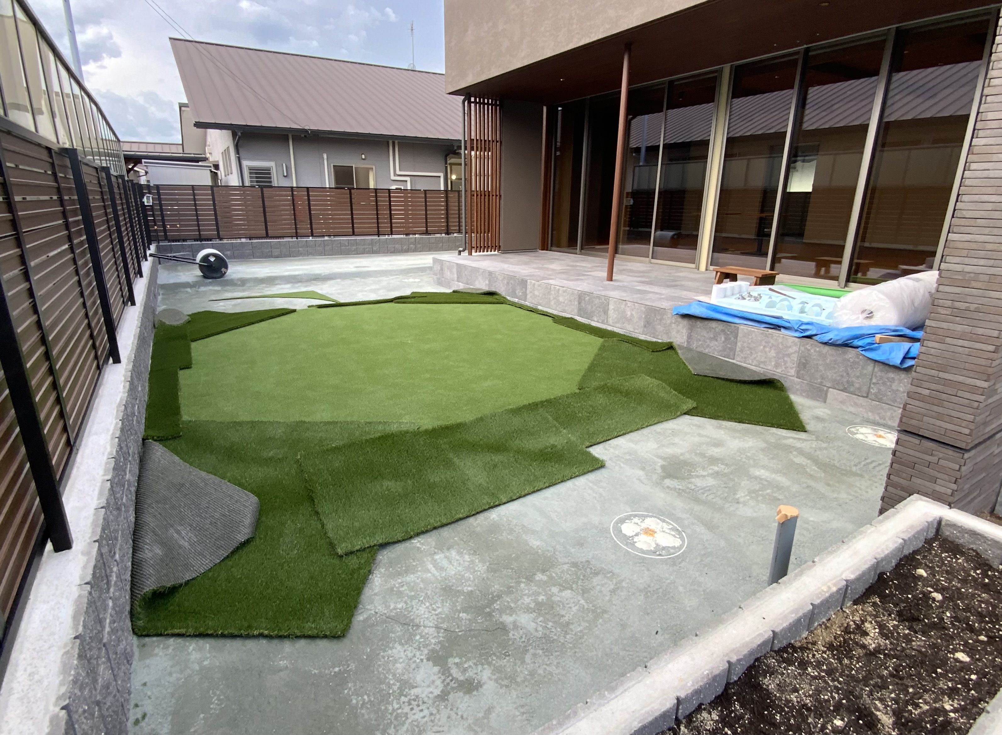 今回のお客様は趣味がゴルフということもあり、庭全体をパター練習ができるグリーンをつくる工事に立ち会いました。