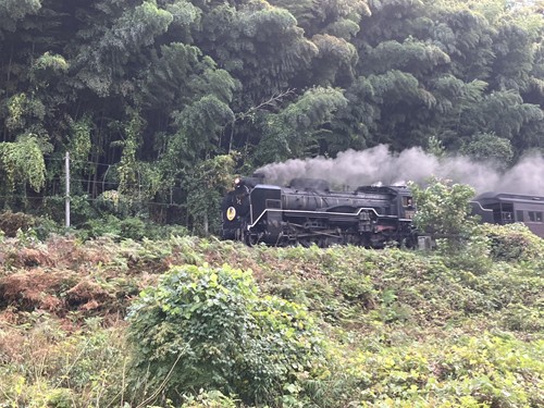 秋風が心地良く、地元特産の鮎の塩焼きや阿東牛を味わいながら、ちょうど通過したSLやまぐち号に手を振る子供たち。