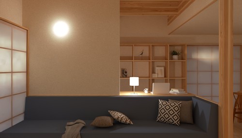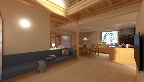 調湿機能の高い珪藻土や足触りの良い杉フローリング、タイル・家具・照明など、