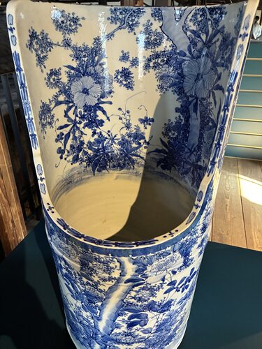 陶器の小便器。綺麗な絵柄で不浄の場のイメージを変える目的があったようです。