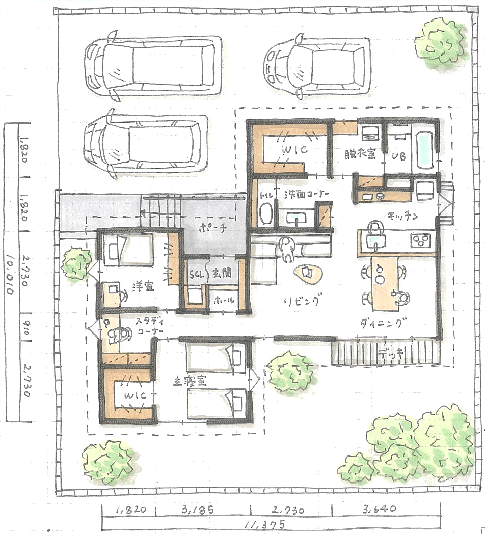 今回の家族想定は3~4人家族の平屋の暮らし…。