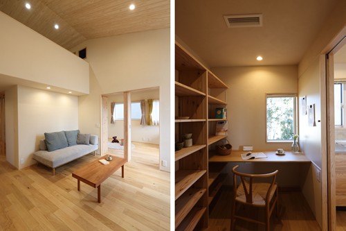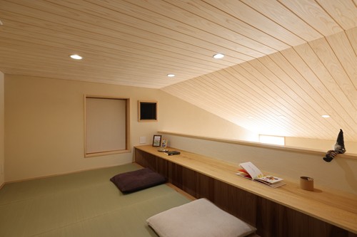 ・ロフト感覚で使える小屋裏のスタディコーナーは、隠れ家のようなわくわく空間。リビングの気配を感じつつ、ごろっと横になれるタタミのゆっくり過ごせる書斎としても活用できます。