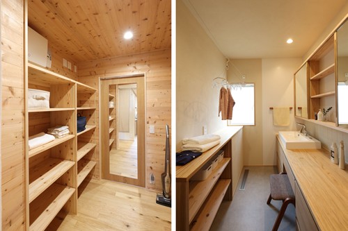 ・家の中心に配置したファミリークロークや、 乾太くん設置とスッキリと収納も充実させた洗面脱衣室。