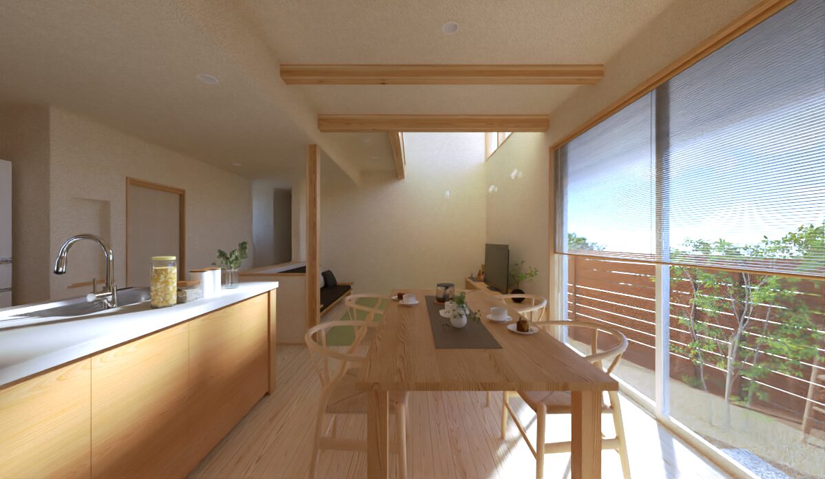 ・大きな開口部から差し込む光と風に包まれ、ピアノの音色がやさしく響くダイニング。食卓が、家族の特別なひとときに変わります。
