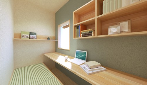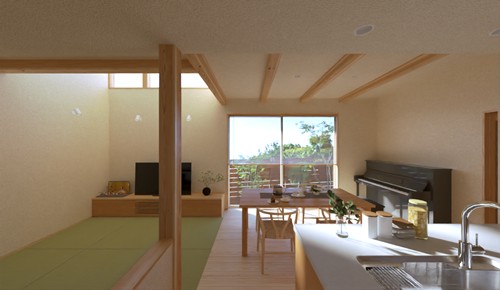 ・畳に腰をおろし、空を眺めながら落ち着いて過ごせる吹き抜けのリビング。自然と家族が集まりたくなる心地よい空間です。