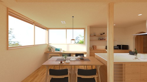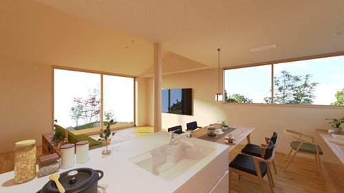 ・ダイニングには、道路からの視線を遮る腰窓を配置。空をたっぷりと眺められる大パノラマ窓からは、光と風がやさしく通り抜けます。