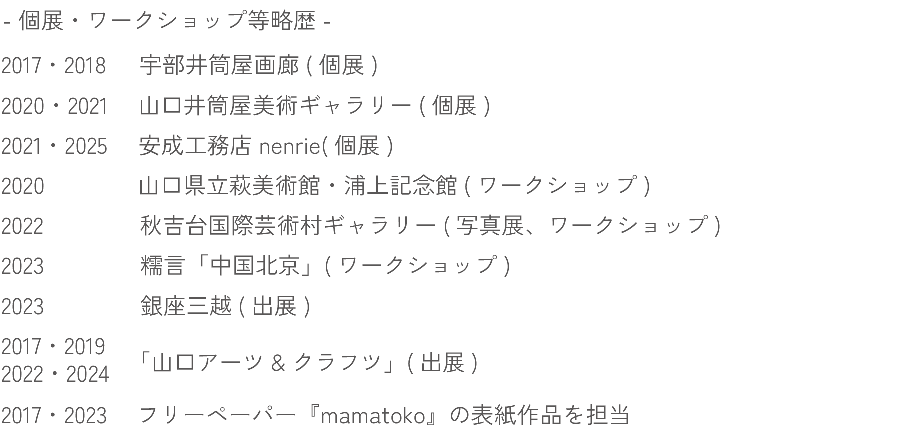 2015年から「旅する羊毛」として野生動物をモチーフにした作品を制作。現在は山口県を中心に個展や写真展、ワークショップを行う。