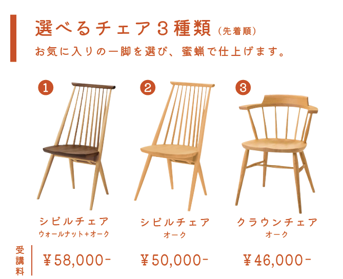 3種類の椅子の中からお好きな椅子をお選びいただき、蜜蝋仕上げ体験をしていただけます。