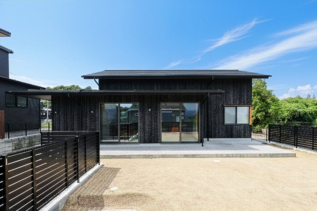 ⑤ 深い軒と焼き杉が印象的な外観は、