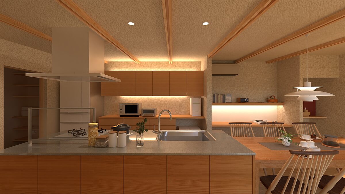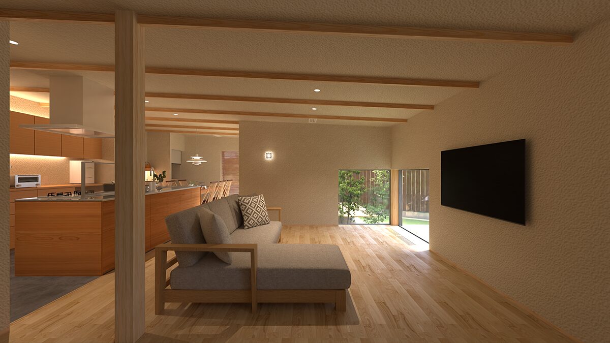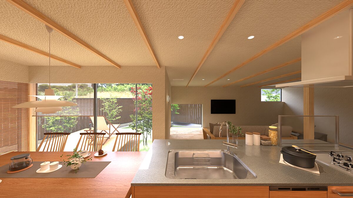 ❸ 勾配天井+化粧垂木の開放的なLDK。