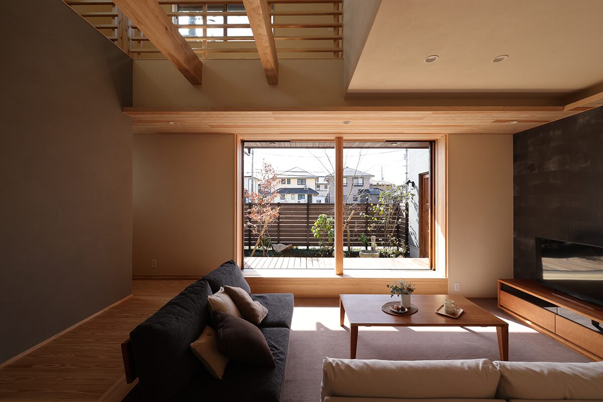 床より一段低く設えたリビングでプライベートな空間を演出。