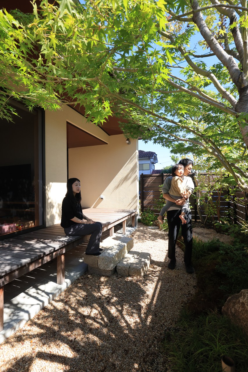 ご主人 目前に大きなマンションがあるのでリビングが見えてしまうのではないかと心配でしたが、大きな植栽でプライバシーが守られるよう配慮していただき、リビングから常にお庭が見えることで光と緑が調和する癒しの空間となりました