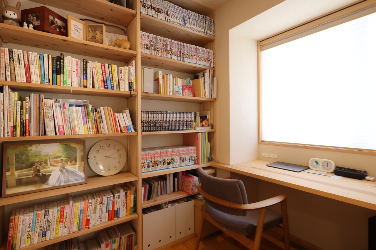 本が好きなのでその空間にいるだけでテンションが上がります。扉をつけるか迷いましたが、座ってもみんなの様子が見えるし、結果的にはなくてよかったです。
