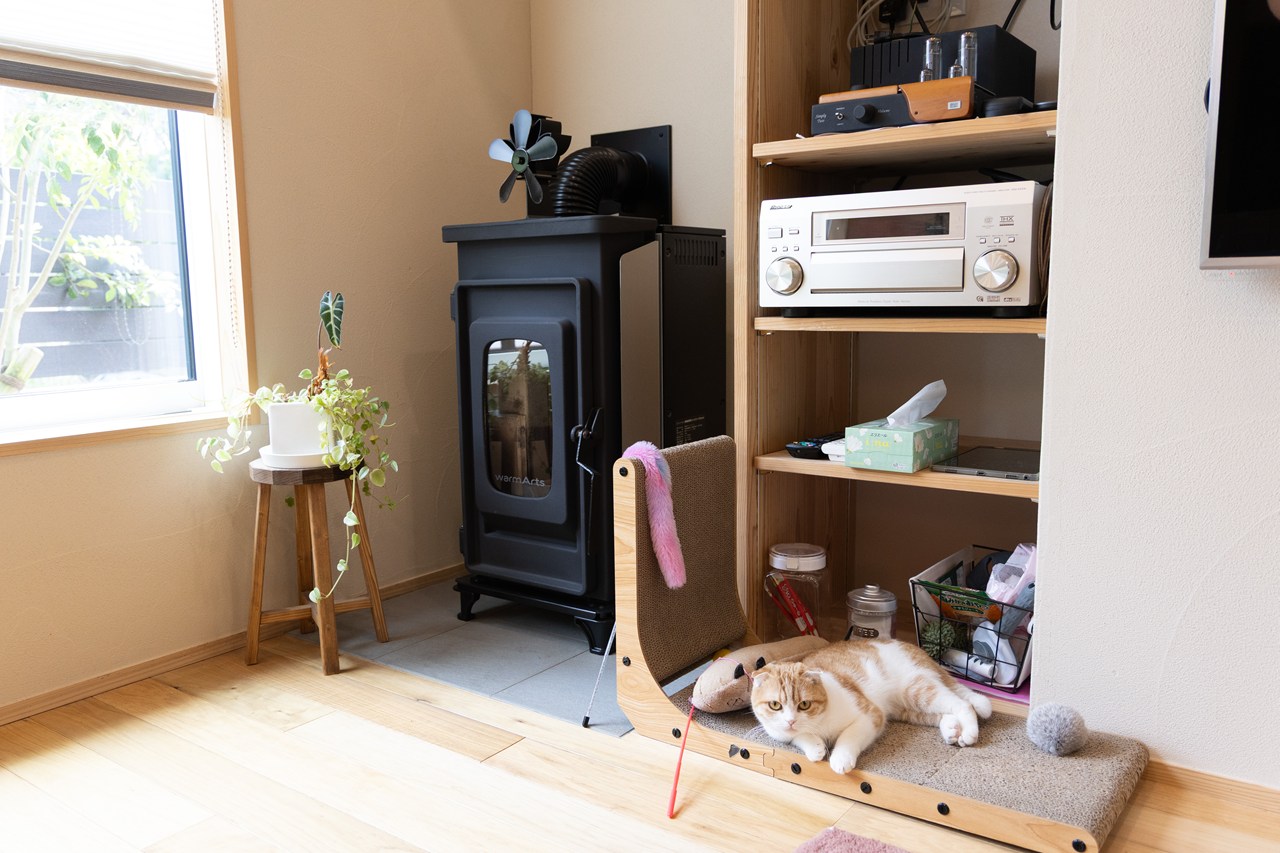 冬でも朝起きた時に寒くないですし、床も素足で歩けるんですよ。ペレットストーブ1台で家全体がほんのり暖かくて、寝室のエアコンは一度も使っていません。これが木のぬくもりなんでしょうね。何とも言えない幸福感があります。