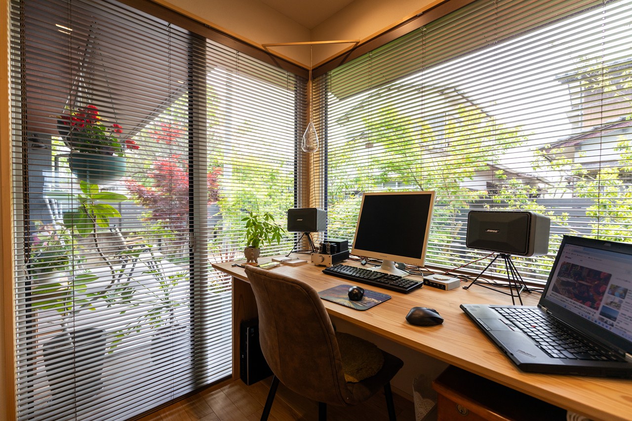 ご主人 私は書斎ですね。最初は個室にしようかと思ったけど、閉めるとエアコンが必要になるから、扉をなくしてリビングとつながる開放的な空間にしました。大きなガラス窓から庭が見えるのが最高ですよ。