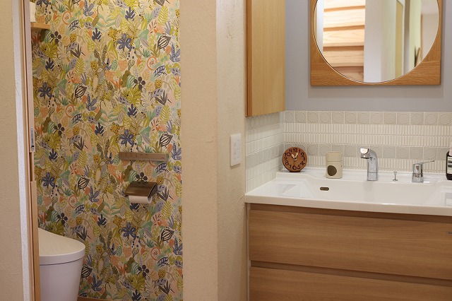 奥様 私のお気に入りはトイレと洗面スペースです。ミナペルホネンのタイルをあしらい、鏡や照明にもこだわりました。朝の支度をしていても、気分が明るくなるんです。