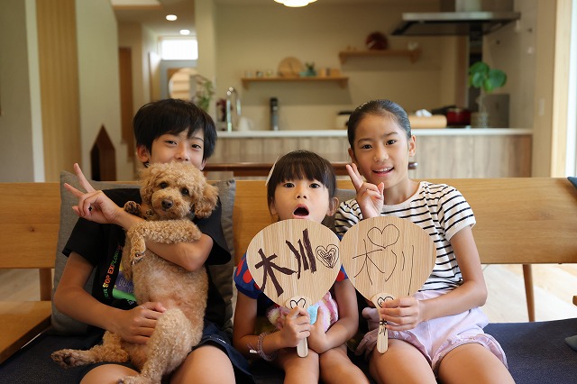 奥様 やっぱり決め手は、岡本さんをはじめスタッフの皆さんの人柄です。お会いする方どなたも温かく、スタッフ同士の雰囲気もとても良い。職場の環境が良いからこそ、良い家づくりにつながるのだと思います。それに、私たちはトライウッドの木川さんの大ファンで、推しうちわまで作ったんですよ(笑)。そんな皆さんだからこそ、こんな素敵な家を建てられるのだと感じています。