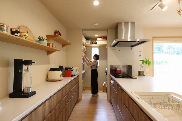 奥様 生活感を出さないよう冷蔵庫やパントリーを見えない位置に置いたり、吊り戸棚をなくし、ウッドデッキを延ばしたり。LDKを広くすっきりとさせました。また、将来を考えてトイレは2階には作らず、1階に2つ配置し、1階でほぼ過ごせる間取りにしています。