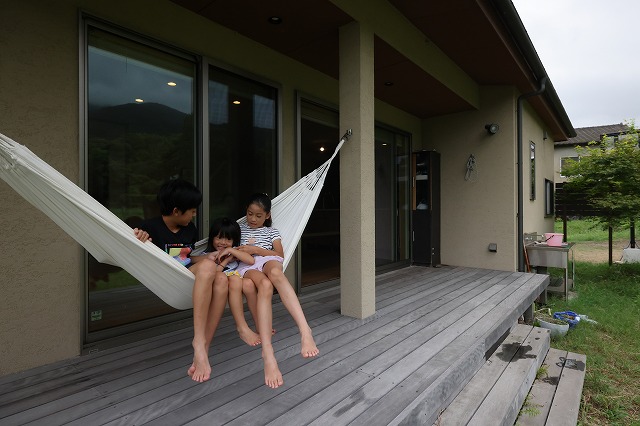奥様 ウッドデッキも大活躍しています。バーベキューをしたり、子どもが段ボールで秘密基地を作ったり、ハンモックをかけて外で過ごすこともあります。季節の良い時期には、外で食事をするのが楽しいですね。