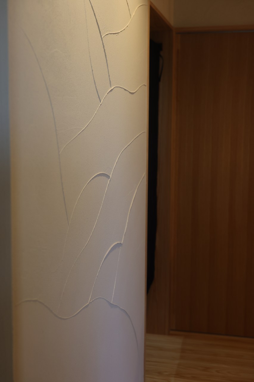 珪藻土に柔らかい光があたり、左官模様の陰影が出ています。