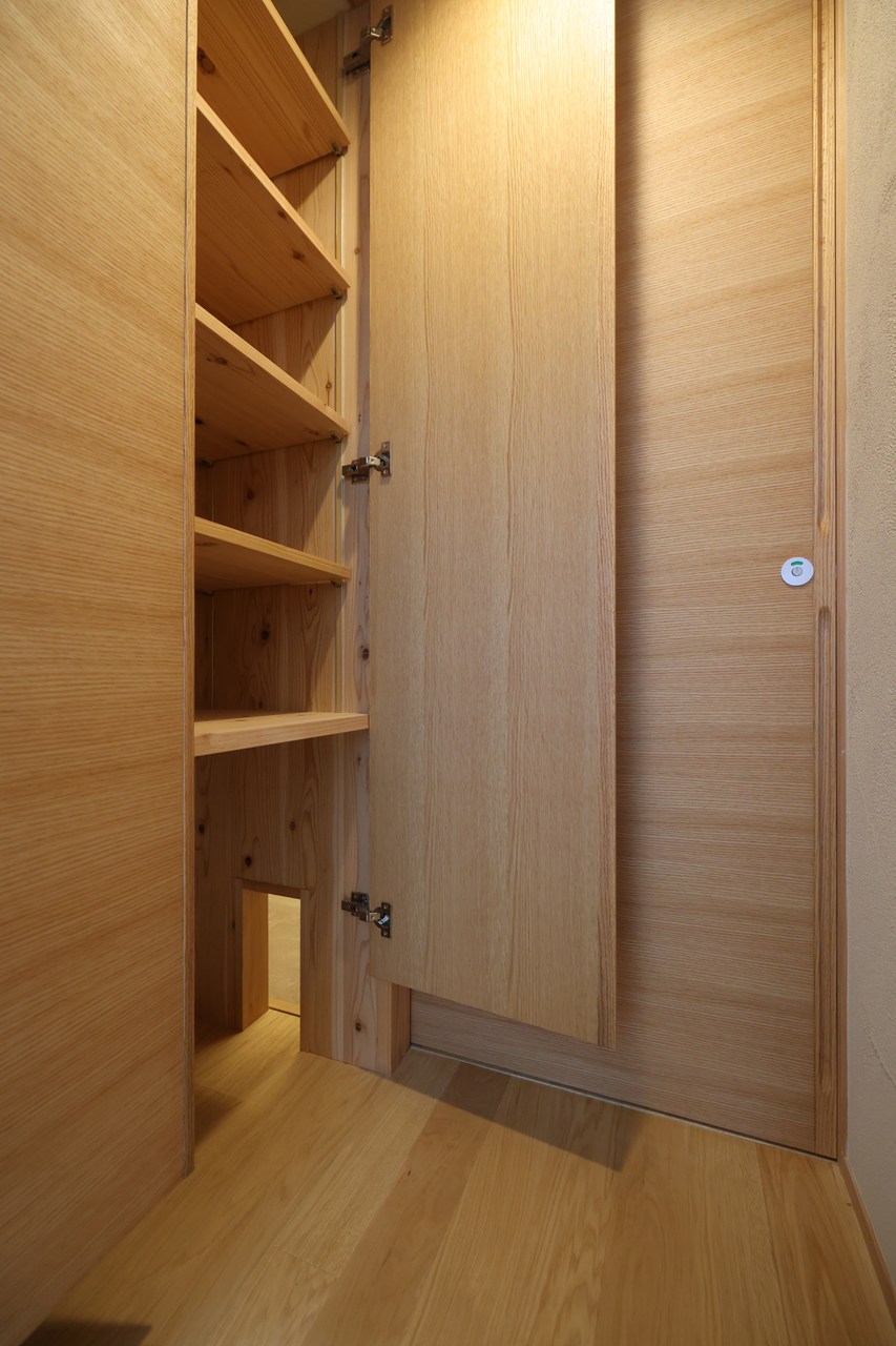 収納の扉を床からすこし上げておくことで、ペットの猫が下をくぐり入ることができます。