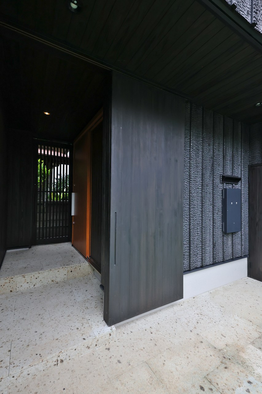 焼杉の外壁に、大谷石の玄関土間。