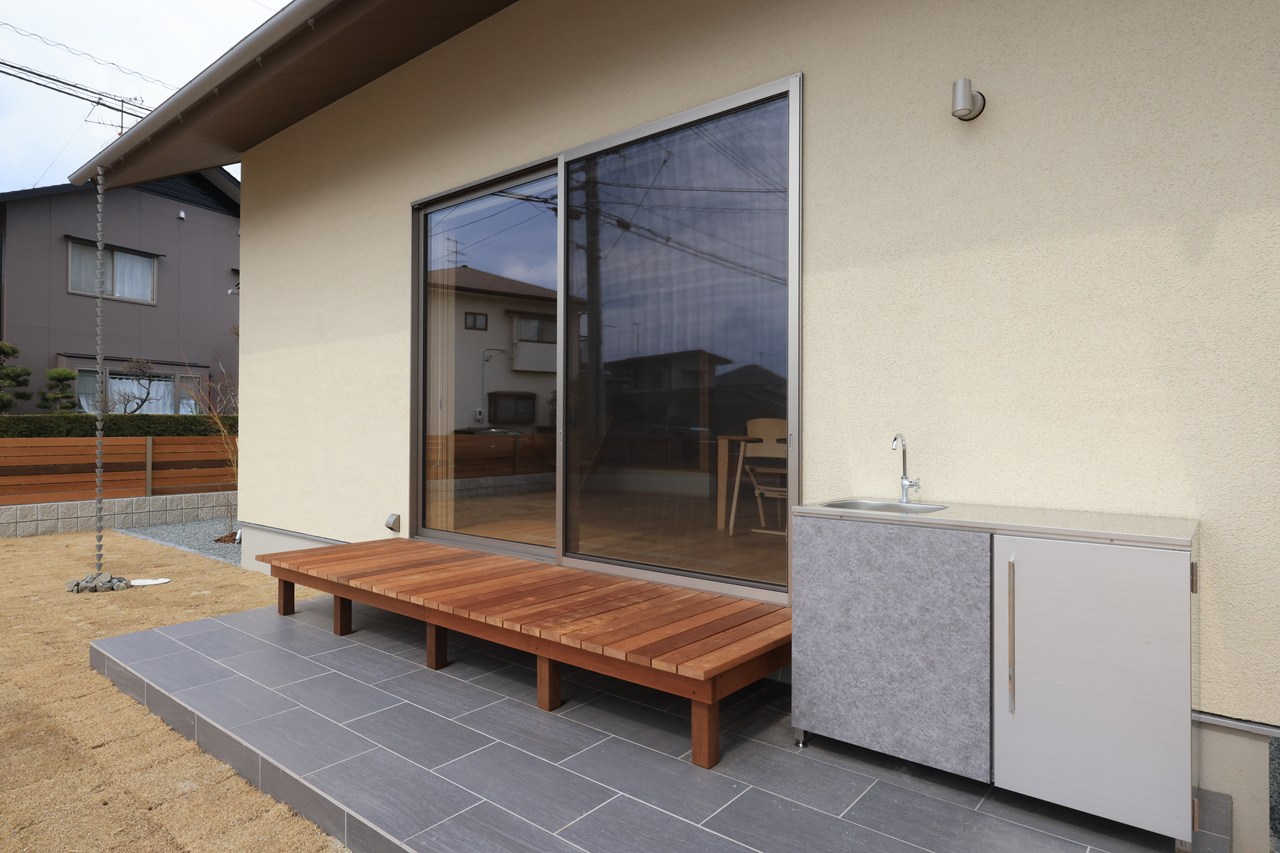 お掃除もしやすいタイルデッキ。家庭菜園で採れた野菜を洗ったり、