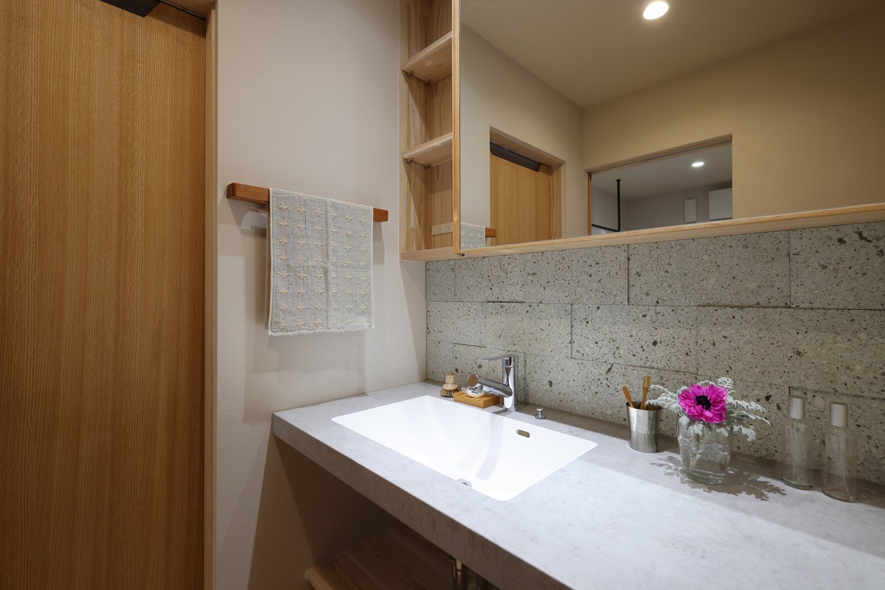 大谷石がアクセントの洗面コーナー