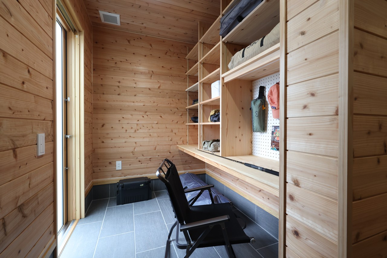 アウトドアや趣味道具を沢山収納できる、玄関ポーチから直結の土間収納。